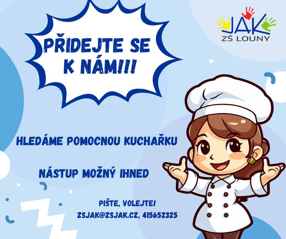 Základní škola JAK Louny přijme do svého týmu pracovníka na pozici pomocná kuchařka / pomocný kuchař do školní kuchyně.