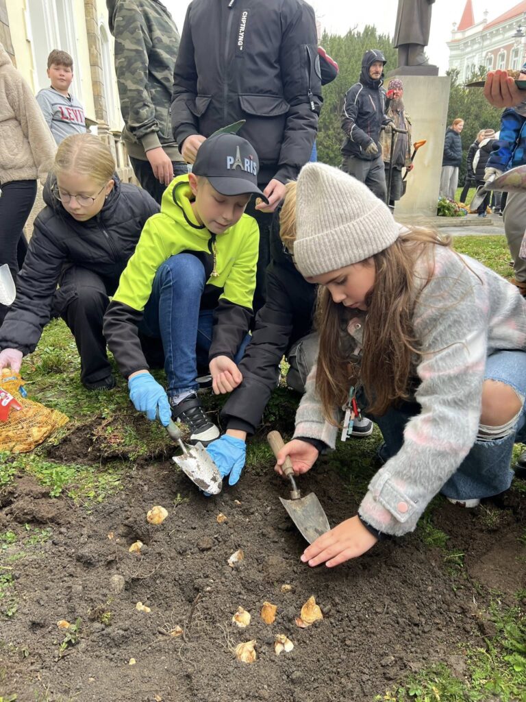 Dnes se naši páťáci zapojili do projektu Květinové město. Na prostranství u památníku T. G. Masaryka zaseli několik stovek cibulek tulipánů, narcisů, sněženek a dalších květin, které na jaře rozzáří prostor před školou.